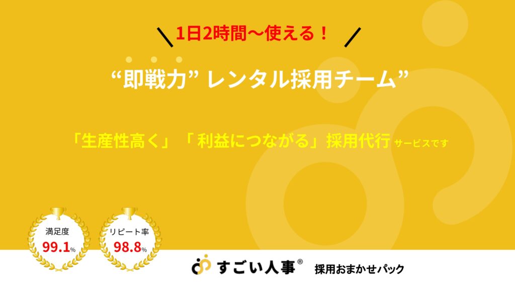 1すごい人事採用おまかせパックは、一般的なRPOとは異なり、単なる作業代行にとどまらず成果へ直行するための伴走支援を行っています。蓄積されたナレッジと独自手法を基盤にしているため、採用スキームを最短2週間ほどで形にできるところが大きな特徴です。これまでに作成した求人票は約6,000枚、送付したスカウトは約20万通、実施した面談面接は約15,000件を超えており、こうした実務に裏づけられた知見から成果までの道のりを短くできます。これまで手間や費用がかかりがちだった採用活動を見直し、タイパとコスパに優れたプロセスへと転換できるようになり、企業が採用成功へ向けた流れを描きやすくなる点も魅力として挙げられます。