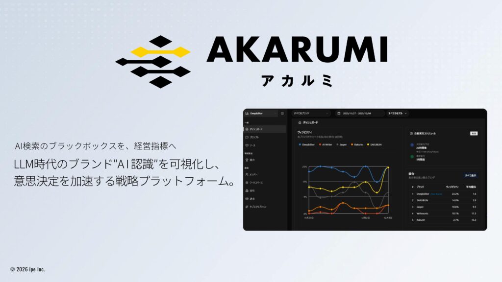 1AKARUMIにはビジビリティ分析機能が備わっており、会話内で自社ブランドがどの程度取り上げられているかを数値として把握できます。言及の割合を確認することで、どれほどの頻度で話題に登場しているのかを具体的に理解できる点が特徴です。これにより、これまで曖昧になりがちだった露出状況を、客観的な指標として捉えやすくなっています。従来のLLMO対策においては、AIがどのブランドをどのような文脈で紹介しているのかを正確に把握することが難しく、投資の判断や改善施策の方向性が感覚に左右されやすい傾向がありました。その結果、十分な根拠を持たないまま施策を進めてしまうケースも見受けられます。一方でAKARUMIを活用すれば、AI上での自社ブランドの扱われ方や競合との位置関係を定量的に可視化することが可能となります。
