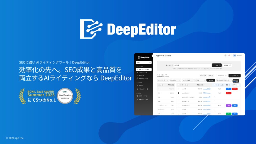 1DeepEditorは、コンテンツ制作に必要な機能を一つに集約したAIライティングツールであり、効率的なSEO記事作成を支援します。特に、訴求したいテーマに関連するキーワードや、競合が上位表示している検索ワードをスムーズに調査できる点に強みがあります。従来のように複数のツールを使い分ける必要がなく、一つの環境でリサーチを完結できるため、作業全体の効率化につながります。また、検索ボリュームの推移やユーザーの検索意図もあわせて確認できるため、どのキーワードを軸にコンテンツを制作すべきかを判断しやすくなります。データに基づいて方向性を定められることで、狙うべきテーマの精度も高まりやすくなります。これまでの手法では、キーワード調査から記事の初稿作成までに数時間を要するケースが一般的でしたが、DeepEditorを活用することで、こうした工程を数分程度で完了させることも可能です。作業時間の短縮だけでなく、制作スピードの向上にも大きく寄与します。